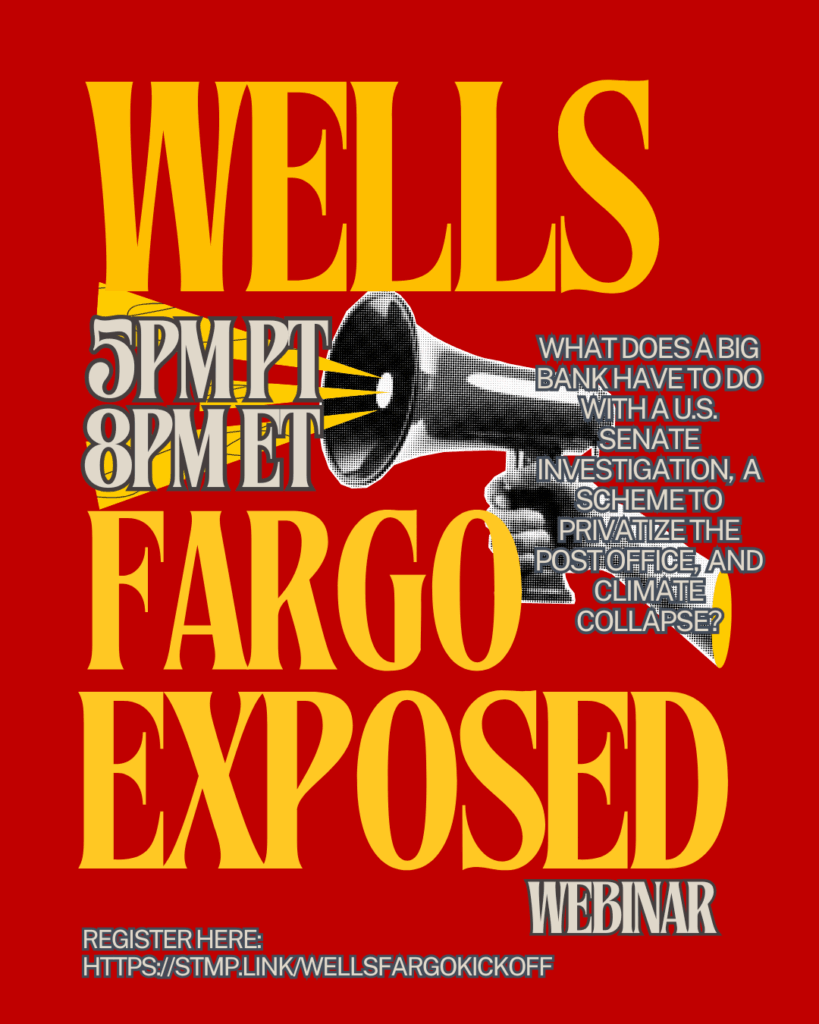 Webinar Wells Fargo Exposed: Pollution, Union Power and the Post Office. Posted on July 24, 2025August 27, 2025 by Austin Miller 24 Jul Continue reading →